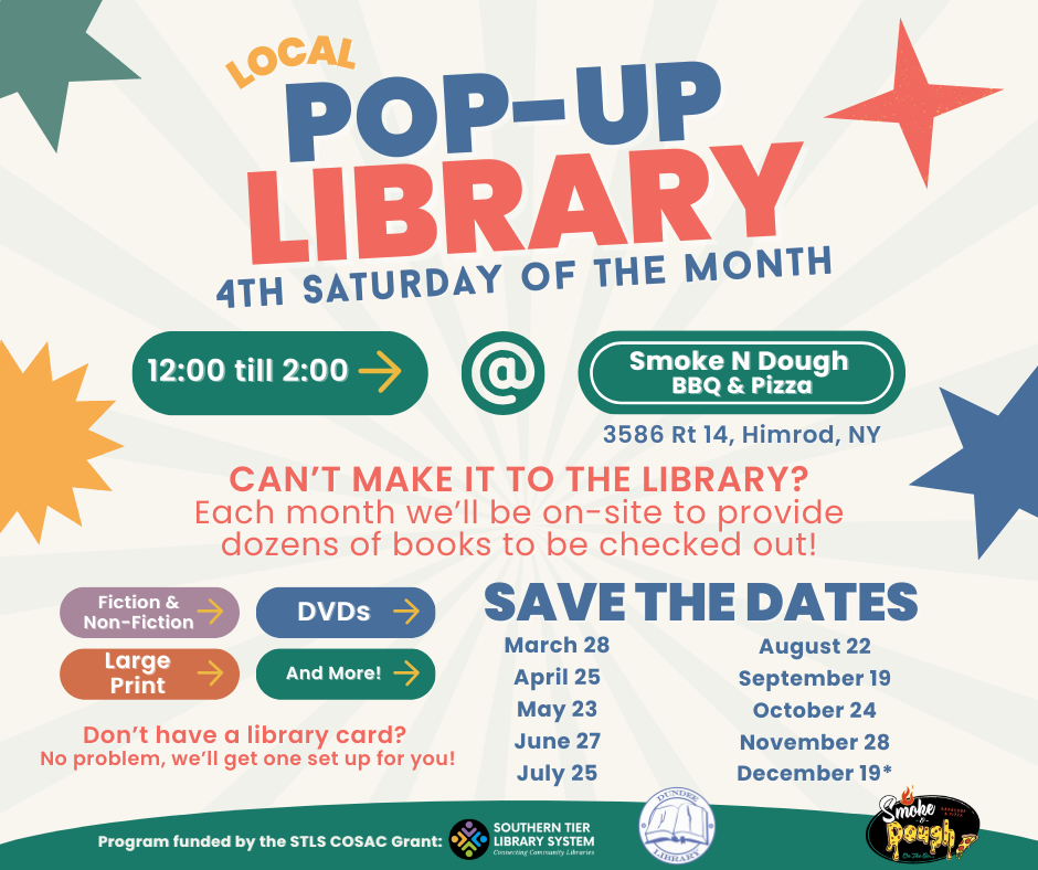 On the fourth Saturday of each month, we’ll be hosting a pop-up library at Smoke N Dough in Himrod, NY. Our hope is to provide our rural neighbors with an opportunity to experience a small bit of the library while not having to travel too far from home.