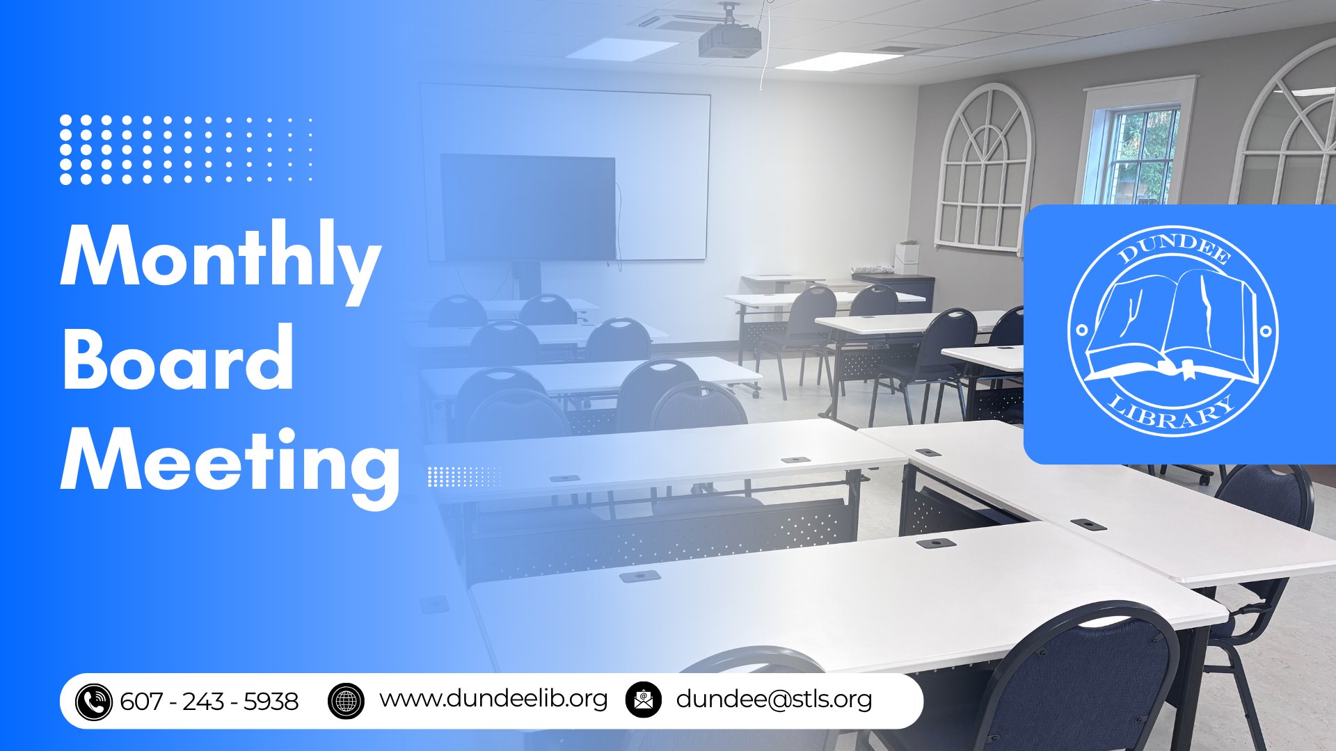 The Dundee Library Board of Trustees will hold its regular meeting on the third Monday of the month in the Tripp Community Room. The meeting is open to the public, and all are welcome to attend.